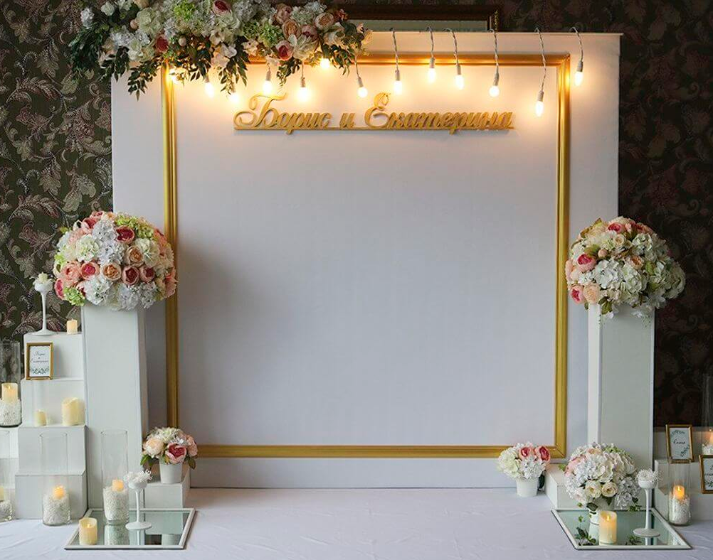 Фотозона с цветами: Это классический и романтичный выбор. Фотозона с цветами может быть выполнена из живых или искусственных цветов, создавая нежный и элегантный фон. Она идеально подходит для свадеб, юбилеев и других торжественных мероприятий.