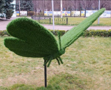 Фигуры из искусственной травы могут быть любых форм и любых назначений: в некоторых парках стоят гигантские слоны и жирафы, в коттеджных поселках попадаются прихотливые клумбы-кошельки, на детских площадках встречаются топиарные гномы и улитки, возле офисных зданий название компании из больших зеленых букв или логотипы.