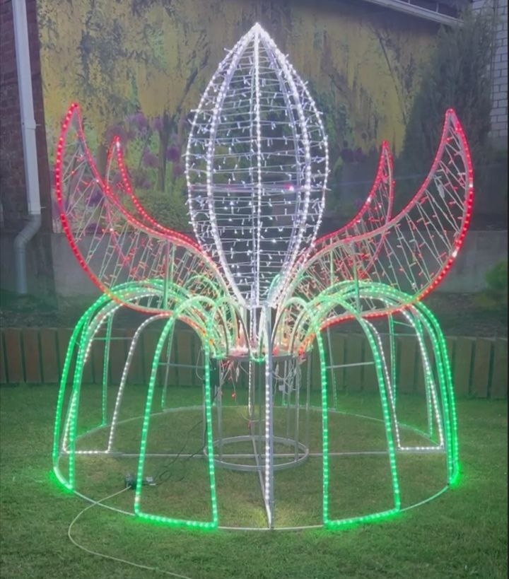 Основным элементом светового оформления служат дюралайт и светодиодные нити. Дюралайт — это гибкий трубчатый материал со встроенными светодиодами, отличающийся равномерным свечением и высокой влагозащитой. Он позволяет создавать плавные линии лепестков и стебля, передавая форму цветка максимально аккуратно. Светодиодные нити используются для акцентных элементов и придают декоративности, усиливая мерцание и глубину свечения. Такие источники света экономичны, долговечны и экологичны.